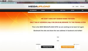 Ciberdelincuentes están intentando sacar provecho del cierre de Megaupload. Se han detectado varios dominios web que intentan engañar a los usuarios simulando el regreso a su actividad de Megaupload. La mayoría de estas estafas utilizan la imagen de Megaupload o Megavideo para engañar a los usuarios y cobrar ingresos por publicidad por sus visitas.